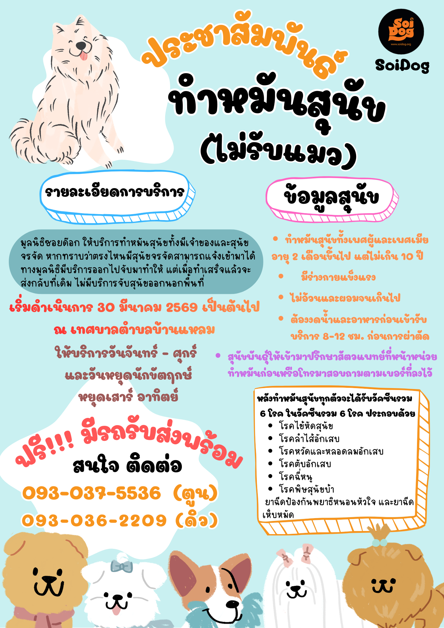 เริ่มดำเนินการวันที่ 30 มีนาคม 2569 ณ เทศบาลตำบลบ้านแหลม หากท่านใดสนใจนำสุนัขไปทำหมัน