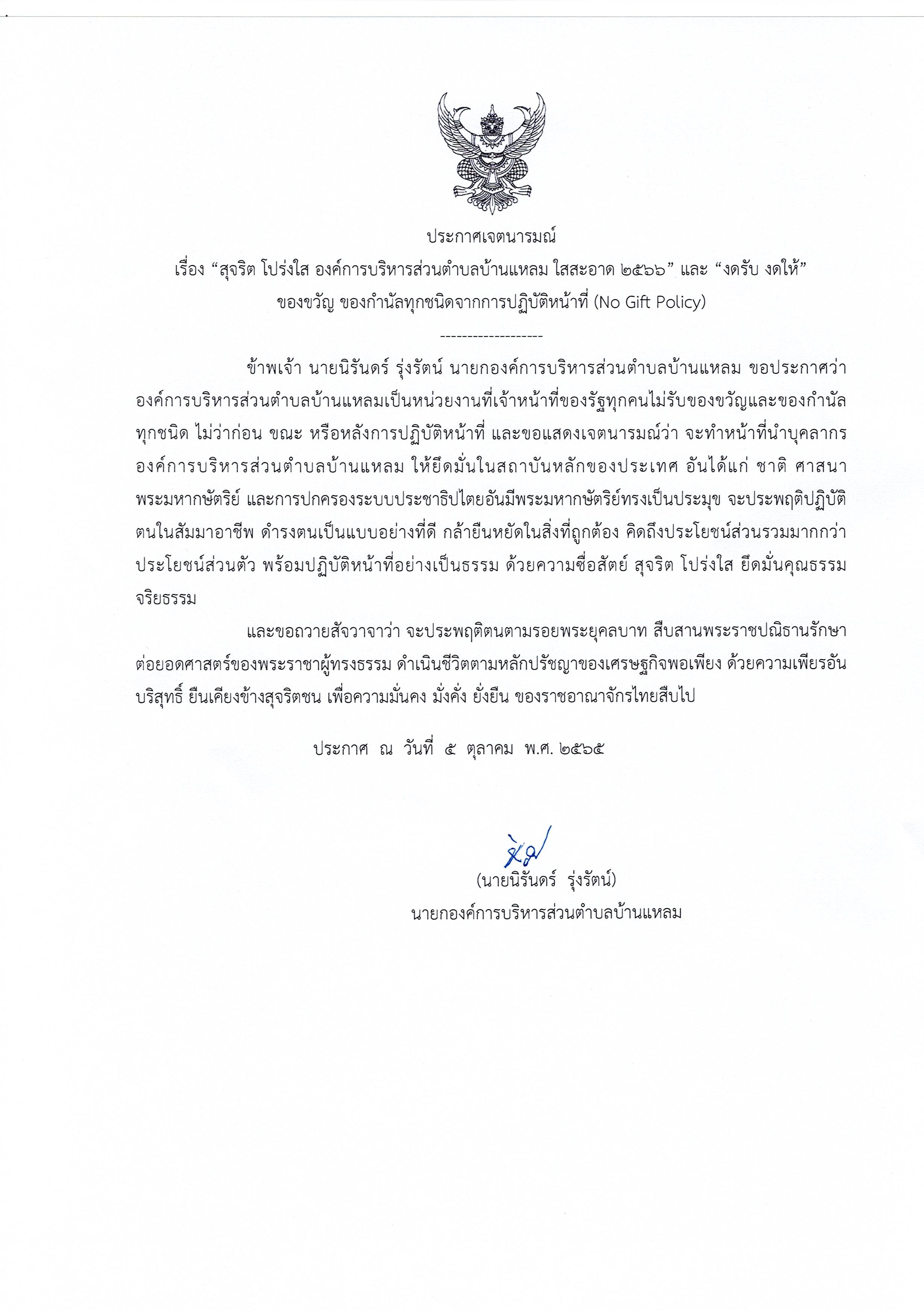 ข้อมูลการดำเนินงาน - ประกาศเจตนารมณ์ตามนโยบาย No Gift Policy